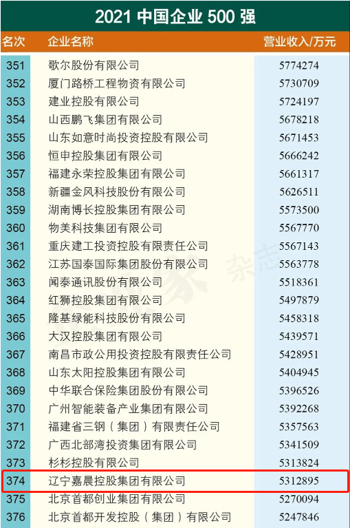9月25日,以“新征程 新使命 新作為:全力推進(jìn)大企業(yè)高質(zhì)量發(fā)展”為主題的2021中國(guó)500強(qiáng)企業(yè)高峰論壇在中國(guó)長(zhǎng)春市舉行。中國(guó)企業(yè)聯(lián)合會(huì)、中國(guó)企業(yè)家協(xié)會(huì)向社會(huì)發(fā)布“中國(guó)企業(yè)500強(qiáng)”名單,遼寧嘉晨控股集團(tuán)榜單排名374位。